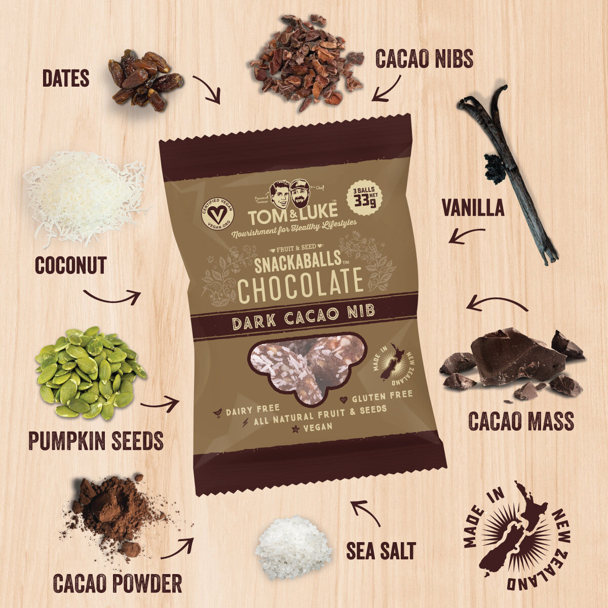 ニュージーランドで人気のパーソナルトレーナー「トム」と、レストランのシェフ「ルーク」により誕生したナチュラルスナックブランド。デーツとカカオをベースに作られたチョコボールは、グルテンフリー・精製砂糖・乳製品不使用。素材本来の甘さと満足感を大切にしています。